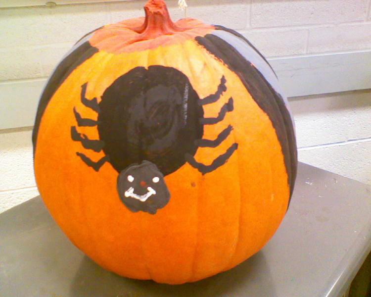 The overall piece is not the best looking, however is some of my best work; I do not have the best artistic abilities, but my efforts suffice the gap.I feel this piece was successful, in the sense that I put in my best efforts and the outcome was relatively close to what I wanted.Well, the spider didn't work out so well, however, the 'Happy Halloween' on the back did turn out nicely. I would consider not making a spider if I were to do this project over again. The most difficult part of this project was painting the spider, and making it look semi realistic. I learned that it is very hard to paint pumpkins, and that's really about it.